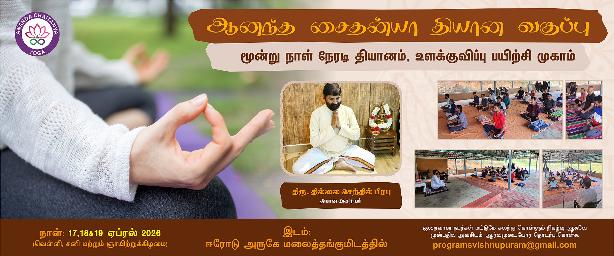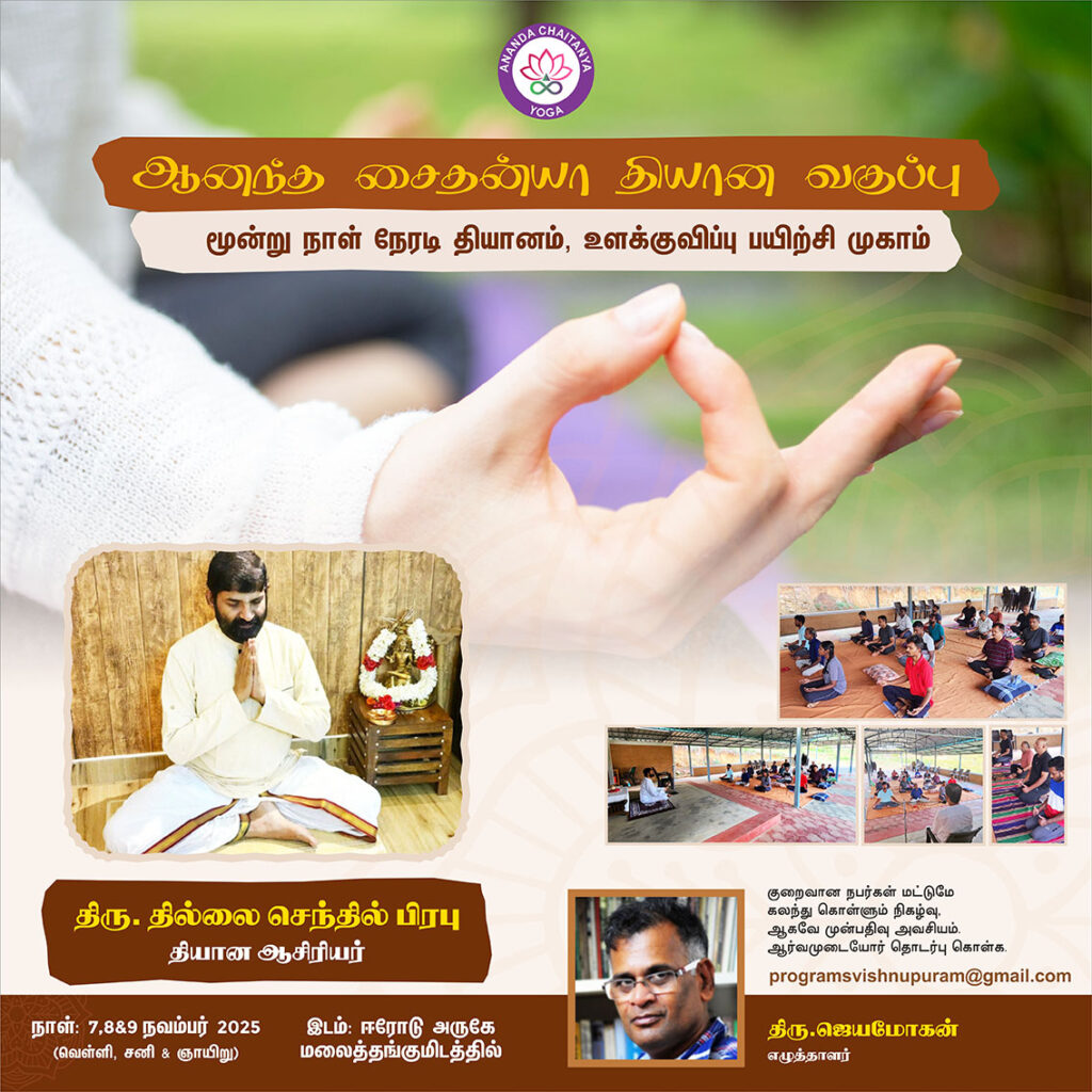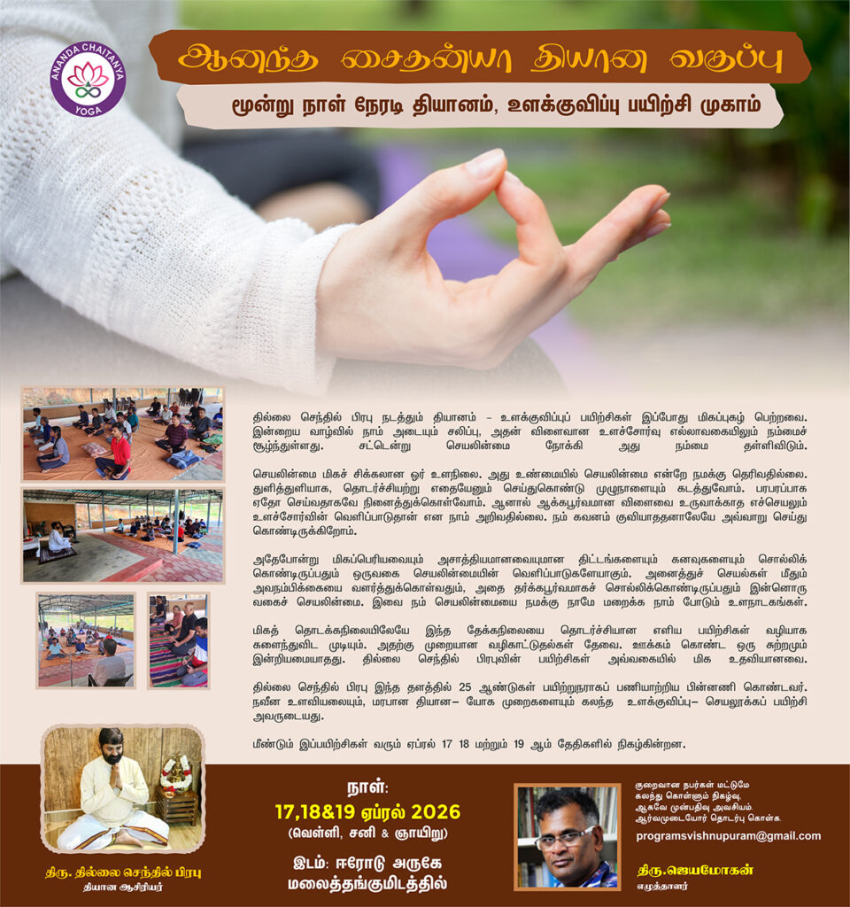 திரு தில்லை செந்தில் பிரபு கற்பித்த தியான வகுப்பில் பங்குபெற்றது பயன் உள்ளதாக அமைந்தது. முதல் நாள் வகுப்பில் யோகம் தியானம் ஆகியவற்றுக்கு ஞானிகளின் விளக்கங்கள் கூறப்பட்டன. சுவாசத்துடன் உடல், மனம் ஆகியவற்றுக்கு உரிய தொடர்பும், சுவாச பயிற்சியின் மூலம் அவற்றின் மீது கட்டுபாடு அமையும் என பயிற்றுவிக்கபட்டது. பின் பிராணயாமம் மற்றும் தியான பயிற்சிகள்.