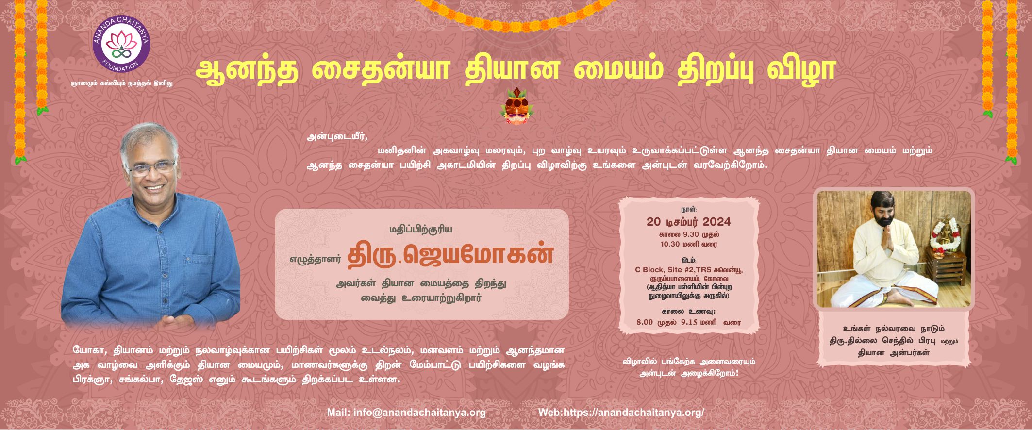 கோவையில் அவர் தனக்கான தியானமையம் ஒன்றை தொடங்கியிருக்கிறார். அதை நான் நாளை (20 டிசம்பர் 2024) அன்று திறந்துவைக்கிறேன்.
